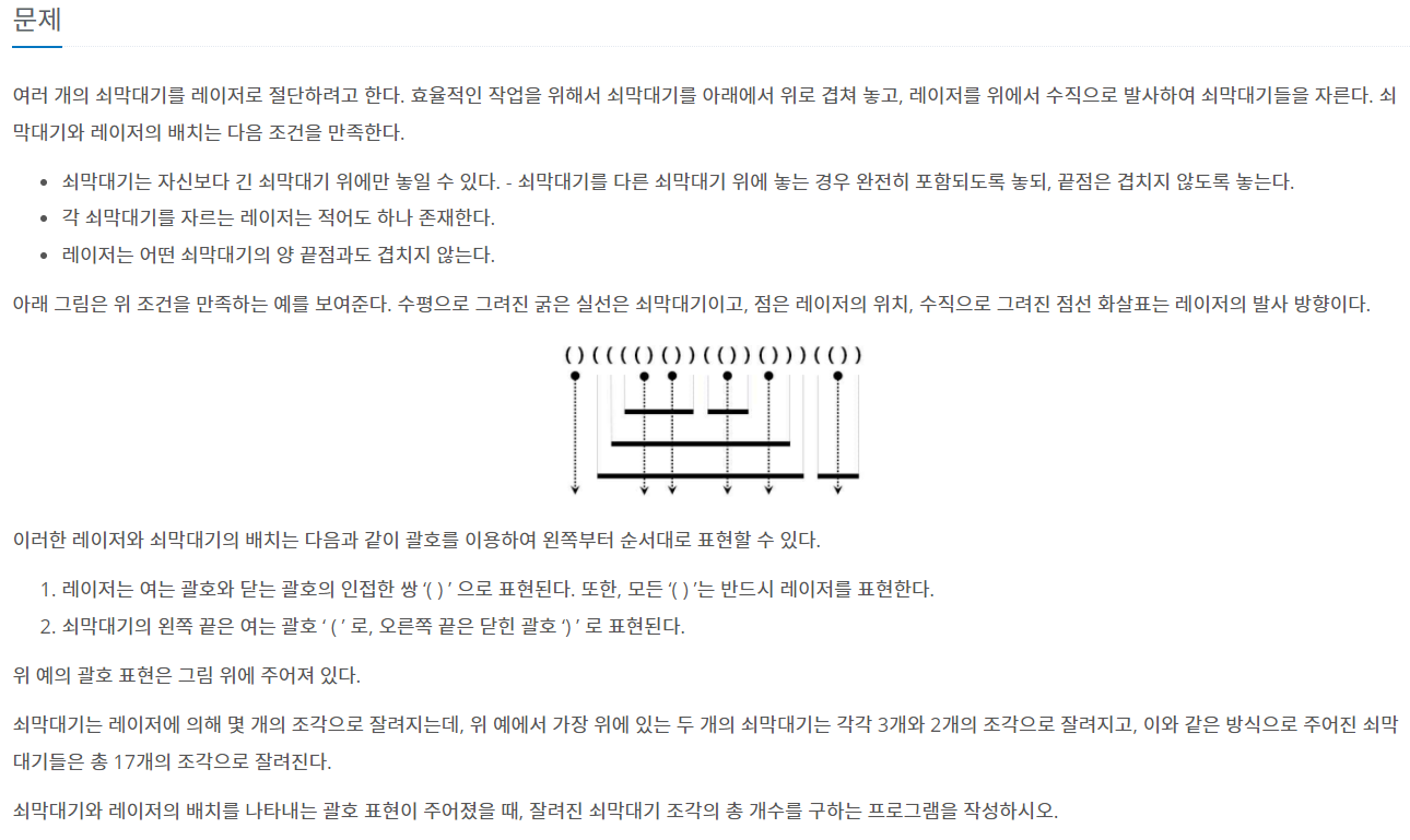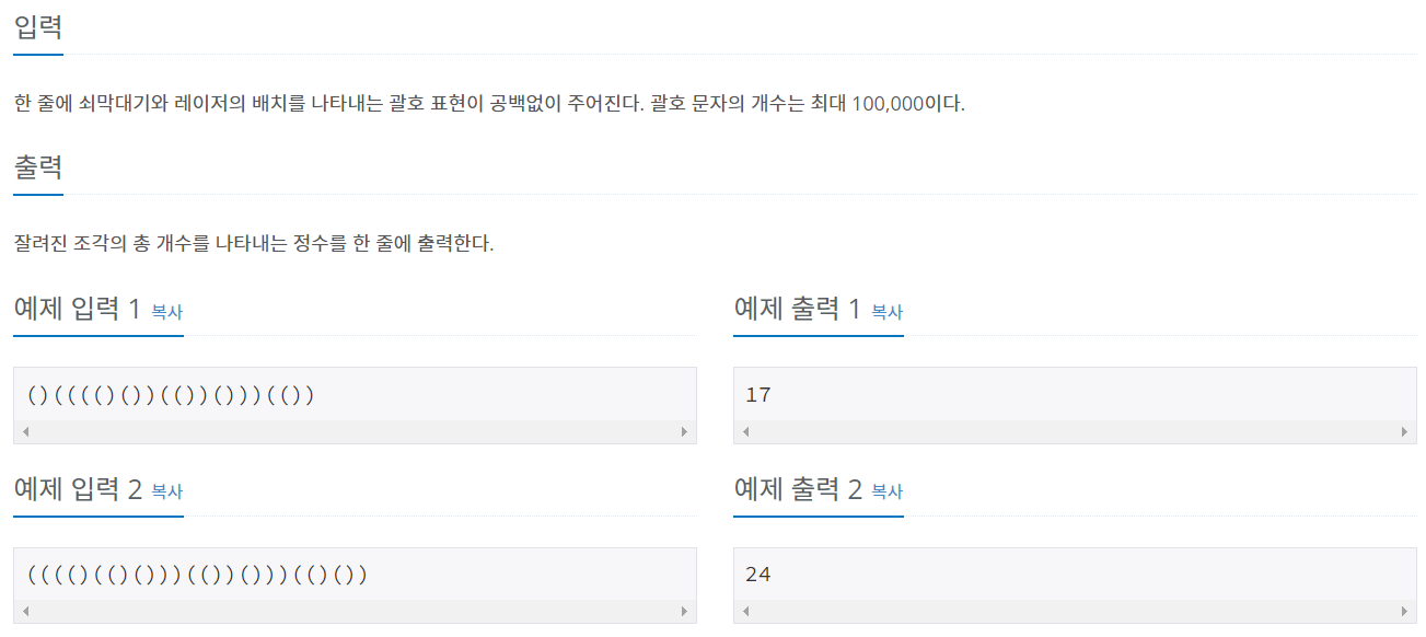 1. 바로 앞에 (가 나올 경우 => 레이저이므로, 지금까지 스택에 저장된 (의 개수를 result에 더해준다.