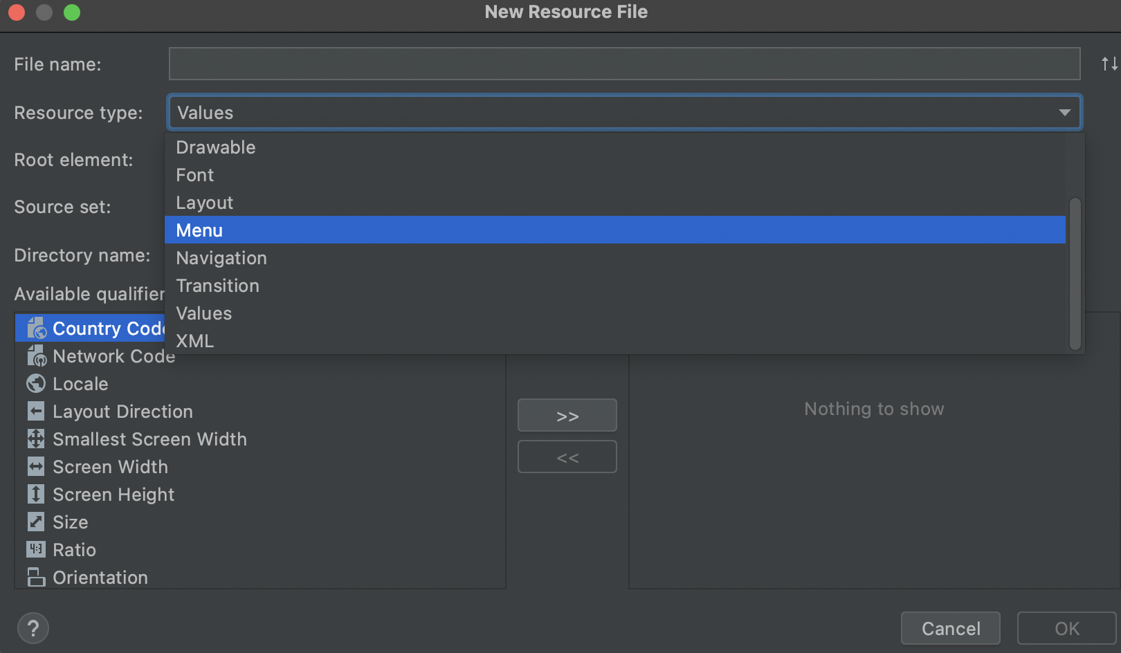 Resource type을 Menu로 하고 Directory name도 menu로 해서 리소스 파일을 생성해준다