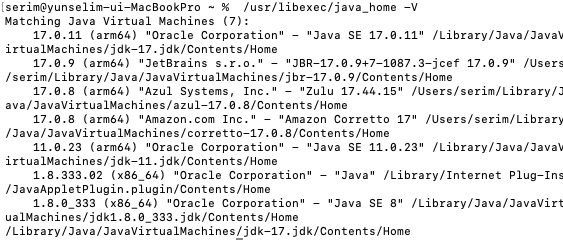 터미널에 아래 명령어들을 입력하여 현재 JDK 버전과 설치된 버전들을 확인합니다.